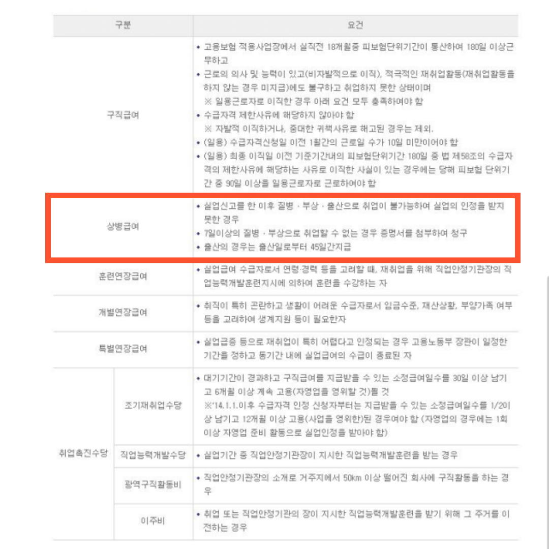 실업급여중 항암 중인 환자의 경우는 빨간 네모 부분 주목